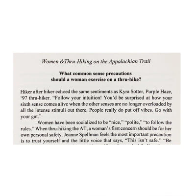 Women & Thru-Hiking on the Appalachian Trail: Practical Advice From Hundreds of Women Long Distance Hikers combines the hands-on advice from hundreds of long-distance hikers on a wide range of concerns. This useful book is broken down into three sections: before, during, and after the hike. The first chapter prepares woman for the vigor’s of the trail, including leaving family members behind, and offers sound advice on gear. The second chapter focuses on safety on the tail and discusses situations specific to female hikers. The final chapter covers post-hike discoveries. Personal experiences of thru-hikers are provided throughout.