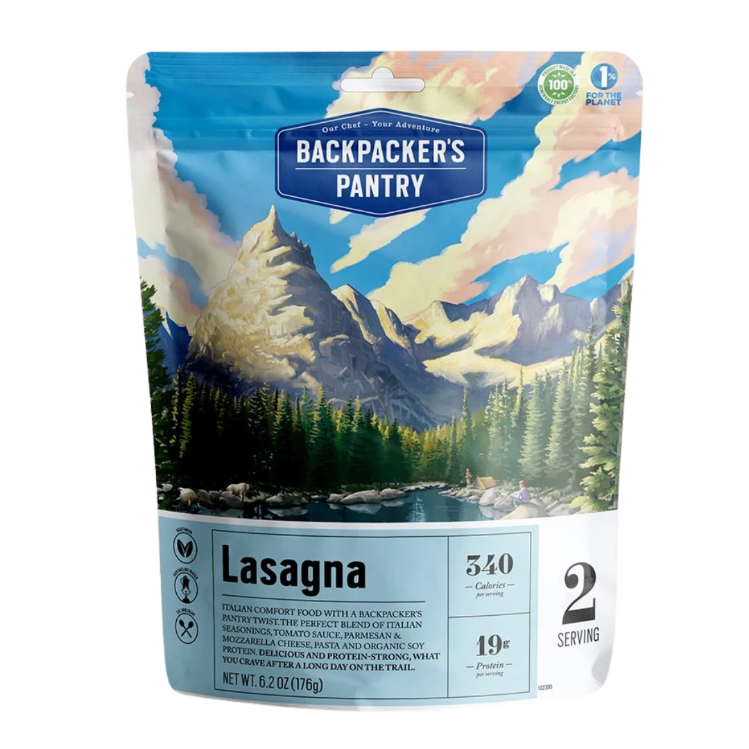 Backpacker’s Pantry Vegetarian Lasagna is an authentic winner with imported freeze-dried Belgian pasta, organic Non-GMO sundried tomatoes, Parmesan Cheese & a ton of international flavor. This is a traditional Italian comfort food with a gourmet backpacking twist. An all-ages crowd favorite Backpacker’s Pantry Lasagna is vegetarian and fast and easy to prepare. Two cups of boiling water and 10-15 minutes for hydration is all you need. With 22 grams of protein coming from Organic non-Gmo Textured Soy Protein. Rich, hearty and great tasting, this high protein vegetarian lasagna this is comfort food at it’s best. Students, mountaineers, hunters & climbers will appreciate the clean flavors & convenience. Serve two hungry people.