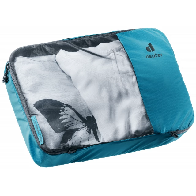 Lightweight zipped bag for organised packing, zip around closure opens out fully , top in see-through airy mesh for better oversight, grab handle.
