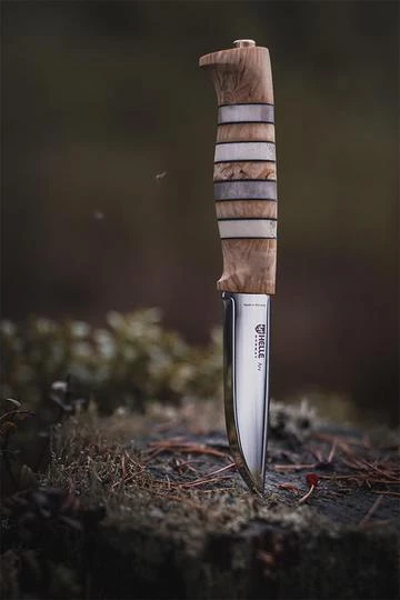 The knife has a small but distinct finger guard and a medium size blade of the finest triple laminated Helle steel. Shaped with a scandi edge and sharpened by hand to a razor-sharp edge.