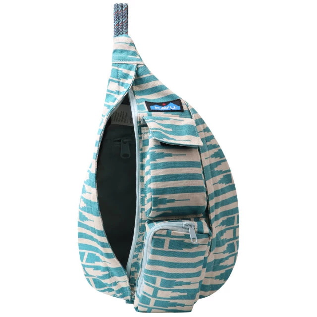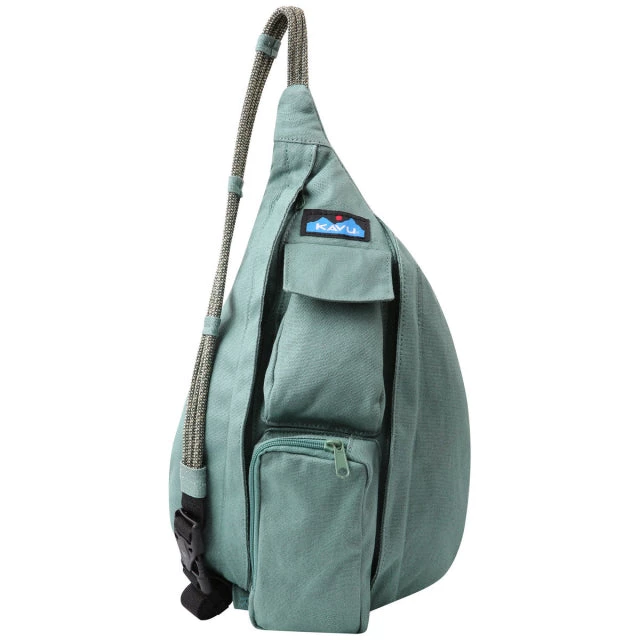 Mini sling pack with adjustable rope shoulder strap, two vertical zip compartments, two key or cell phone pockets, padded back with KAVU embroidery. Unisex. Dimensions: 16″ x 9″. Fabric: 12oz cotton canvas.