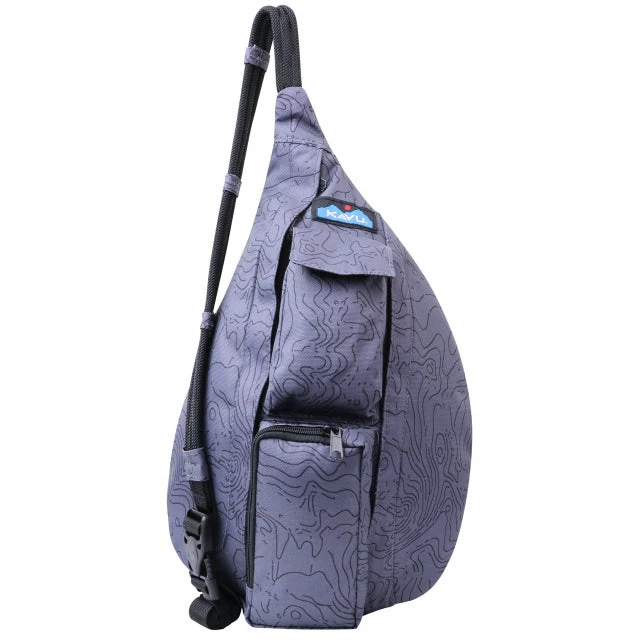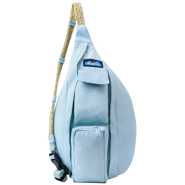 Mini sling pack with adjustable rope shoulder strap, two vertical zip compartments, two key or cell phone pockets, padded back with KAVU embroidery. Unisex.