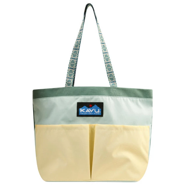 This burly tote made of cotton canvas and 600D water resistant polyester is great for a day out on the boat with friends or a trip to the local co-op. Complete with classic KAVU pattern webbing straps and two exterior pockets, this open tote can haul your towels, snacks, beverages, or small dog. Color block tote, fixed pattern webbing shoulder straps secured with box stitch, two exterior cargo pockets, internal zip and gusset pocket
