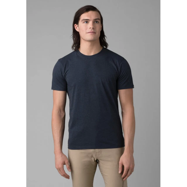 Organic cotton/recycled polyester blend lightweight jersey ; prAna crew neck basic tee with a woven label on wearer’s left sleeve ; Standard fit