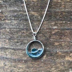 This beautiful sterling silver necklace is made by Virginia artisans exclusively for Walkabout Outfitter. It’s representative of our logo with the sun rising or setting over the mountains. The chain comes in two lengths, 16″ and 18″.